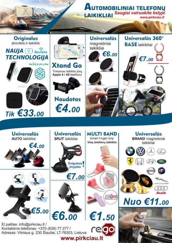 1. Universalus telefonų automobilinis magnetinis laikiklis (Sidabrinis, Rausvas, Auksinis) KAINA 6€; 2. Universalus telefonų automobilinis 360° BASE laikiklis (Juodas, Raudonas) tinka net ir DVIRAČIUI KAINA 7€; 3. Universalus telefonų automobilinis laikiklis (Raudonas) KAINA 4€; 4. Universalus telefonų automobilinis laikiklis (Juodas) KAINA 5€; 5. Universalus telefonų SPLIT laikiklis KAINA 6€; 6. Universalus telefonų SPLIT laikiklis (dvigubos žnyplės) KAINA 7€; 7. MULTI BAND laikiklis KAINA 1.50€; 8. Universalūs BRAND automobiliniai telefonų magnetiniai laikikliai KAINA Nuo 11€; 9. NAUJA TECHNOLOGIJA Originalus NILLKIN telefonų laikiklis ir bevielis įkrovimas KAINA 33€; 10. Xtand GO telefonų automobilinis laikiklis (Naudotas) KAINA 4€;