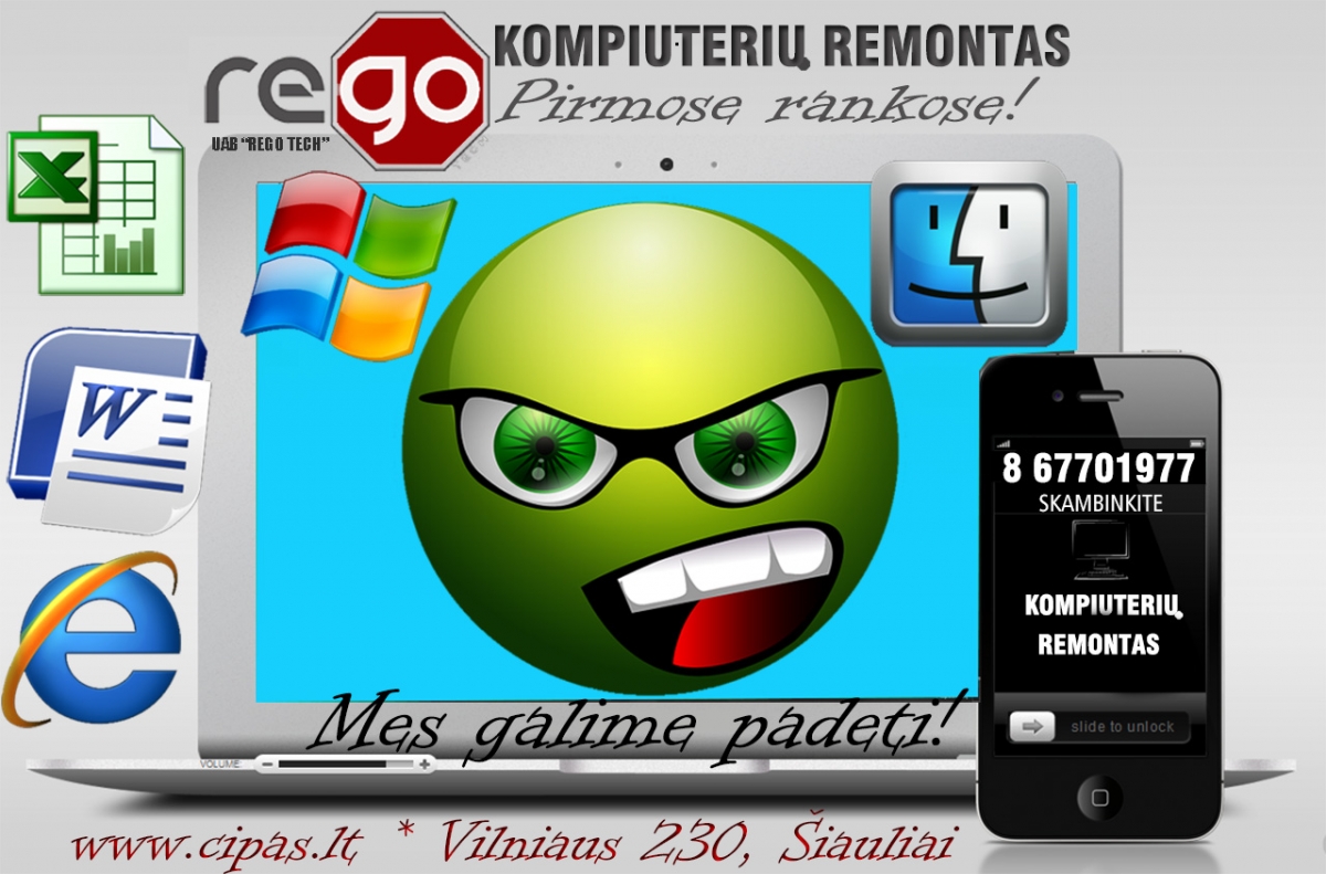 Aprašymas: | SKUBUS, visos programinės įrangos remontas, atnaujinimas Jei Jūsų kompiuteris pradėjo lėčiau dirbti, mėto klaidos pranešimus ar nepasileidžia Jums reikiama programa, kompiuteris Jums pateikia „staigmeną“ – arbo metu Jūs pamatote mėlyną ekrano foną, vadinasi Jūsų kompiuteriui reikalnga specialisto apžiūra, programinės įrangos atnaujinimas. GREITAI – mes Jums programinę įrangą atnaujinsime dar TA PAČIĄ DIENĄ. Ir Jūsų kompiuteris vėl džiaugsis nauju, švariu gyvenimu, o Jūs liksite patenkinti jo darbu. VIETOJE – REMONTAS PRIMOSE RANKOSE. Atnešus savo kompiuterį, jam nedelsiant bus suteikta „pirmoji pagalba“. Jūsų kompiuteris nenukeliaus niekur kitur, tik pas mūsų specialistą. Mes Jums siūlome : - PROGRAMINĖS ĮRANGOS REMONTĄ; - PROGRAMINĖS ĮRANGOS ATNAUJINIMĄ; - NAUJŲ PROGRAMŲ ĮKĖLIMĄ; Taigi jei Jūsų kompiuteriui reikalinga apžiūra, kreipkitės pas mus, mes Jūsų kompiuterį priklesime naujam gyvenimui. Liksite net tik Jūs patenkintas, bet ir Jūsų kompiuteris. MUS RASITE ADRESU: UAB „Rego Tech“ Vilniaus g. 230, Šiauliai (Patogus privažiavimas) El.p. info@cipas.lt Mob.: +37067701977 Darbo laikas: I-V: 9-18 val., VI: 9-14 val. Daugiau informacijos rasite mūsų internetinėje svetainėje: www.cipas.lt MŪSŲ REMONTOS IŠSKIRTINĖS SAVYBĖS: remontas atliekmas vietoje, visa remontui reikalinga įranga vietoje, importuojame iš gamintojų detales už geriausią kainą, visi kompiuteriai registruojami sistemoje, kad klientui būtu ramu ir saugu, remontas atliekmas greitai, kruoščiai, sutaisomi praktiškai visi gedimai, priskiriami profesionalams, visapusiška konsultacija, suteikiama garantija iki 6 mėn. remonto darbams. |