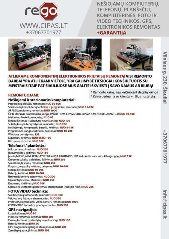 Aprašymas: | Sugedo tavo telefonas, nešiojamas kompiuteris, planšetė ar kitas elektronikos įrenginys? Atnešk jį mums ir mes jį sutaisysime už prieinamą kainą! + SUTEIKSIME GARANTIJĄ! VISKAS KĄ REMONTUOJAME: Nešiojami ir stacionarūs kompiuteriai: Pagrindinių plokščių remontas; NUO 30-60€ Stacionarių kompiuterių techninis ir programinis remontas; NUO 15-20€ APPLE kompiuterių remontas; NUO 190€ ČIPŲ litavimas profesionalia įranga. PAKEISTIEMS ČIPAMS SUTEIKIAMA 6 MĖNESIŲ GARANTIJA! NUO 30-50€ Maitinimo blokelių remontas; NUO 6€ Ekranų keitimas (sudaužytų, neveikiančių); NUO 10€ Sulietų kompiuterių valymas, remontas; NUO 20€ Nešiojamųjų kompiuterių baterijų keitimas; NUO 5-15€ Programinės įrangos sutrikimų šalinimas; NUO 10-20€ Windows perrašymas; 15€ Klaviatūrų keitimas; NUO 0€ IKI 15€ Kiti remonto darbai. NUO 10€ Telefonai / planšetės: Mikroschemų litavimas; NUO 25€ Įkrovimo lizdų keitimas; NUO 15€ Įvairių MICRO, MINI, USB C-TYPE 3.0, APPLE LIGHTNING, SIM lizdų keitimas ir visos kitos jungtys; NUO 15€ Dr ėgmės sukeltų pažeidimų šalinimas; NUO 25€ Skendusių telefonų remontas; NUO 25€ Korpusų, mygtukų keitimas, taisymas; NUO 10-20€ Ekranų keitimas; NUO 10-30€ Baterijų keitimas; NUO 10-30€ Ištrintų duomenų atstatymas; NUO 30€ Užrakintų telefonų atrišimas.; NUO 25€ Duomenų iškėlimas.; NUO 10€ Operacinės sistemos perrašymas, atnaujinimas (Android / iOS); NUO 20€ FOTO/VIDEO technika: Skaitmeninių fotoaparatų remontas; NUO 35€ Veidrodinių fotoaparatų remontas; NUO 35€ Profesionalių studijinių video kamerų remontas; NUO 100€ FOTO/VIDEO technikos priedų remontas; NUO 25€ GPS navigacijos: Lizdų keitimas; NUO 8€ Plokščių remontas, keitimas; NUO 20€ Ekranų keitimas (sudaužytų, neveikiančių); NUO 15€ Baterijų keitimas; NUO 5€ GPS programinės įrangos atnaujinimas; NUO 20€ Žemėlapių atnaujinimas; NUO 10€ Kompiuterinė technika: Stacionarių LCD/LED monitorių remontas; NUO 20€ Stacionarių kompiuterių modernizavimas; NUO 15€ Kiti kompiuterinės technikos remonto darbai. NUO 10€ Elektronikos prietaisai: Automobilinių televizorių remontas; NUO 30€ Ir kita elektroninė technika. NUO 20€ Žemės ūkio technika: Elektroniniai valdymo blokai; NUO 80€ Spausdintuvai: Lazerinių ir rašalinių spausdintuvų remontas; NUO 30€ Didelio formato braižytuvų bei spausdintuvų remontas; NUO 80€ Gedimo nustatymas (diagnostika) nemokamas. Nustačius gedimą, informuojame klientą apie remonto kainą ir laiką. Spausdintuvų kasečių keitimas: NUO 5€ MUS RASITE ČIA: Vilniaus g. 230, Šiauliai UAB "Rego Tech" Mob.: +37067701977 info@cipas.lt |