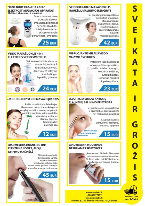 Aprašymas: | www.marsietis.lt - veido priežiūros prietaisai geromis kainomis! Pristatymas visoje Lietuvoje per 1-2 d.d. WWW.MARSIETIS.LT +37063977277 info@marsietis.lt Vilniaus g. 230, Šiauliai / Tilžės g. 1047, Šiauliai 1. "TENS Body Healthy Care" Elektrostimuliacijos aparatas, skausmui šalinti + masažas, meditacija. KAINA 25 EUR. 2. Veido ir kaklo masažuoklis nuo raukšlių šalinimo įrenginys. KAINA 42 EUR. 3. Veido masažuoklis 4in1 | Elektrinis veido šveitiklis. KAINA 24 EUR. 4. Vibruojantis gilaus veido valymo šveitiklis. KAINA 23 EUR. 5. „Jade Roller“ Veido masažo įrankis. KAINA 12 EUR. 6. Electric Eyebrow antakių plaukelių šalinimo prietaisas. 15 EUR. 7. XIAOMI MIJIA Huanxing HN1 Elektrinė nosies, ausų plaukelių kirpimo mašinėlė. KAINA 45 EUR. 8. XIAOMI MIJIA vardinis ir modernus nešiojamas skustuvas vyrams / moterims. KAINA 25 EUR. |