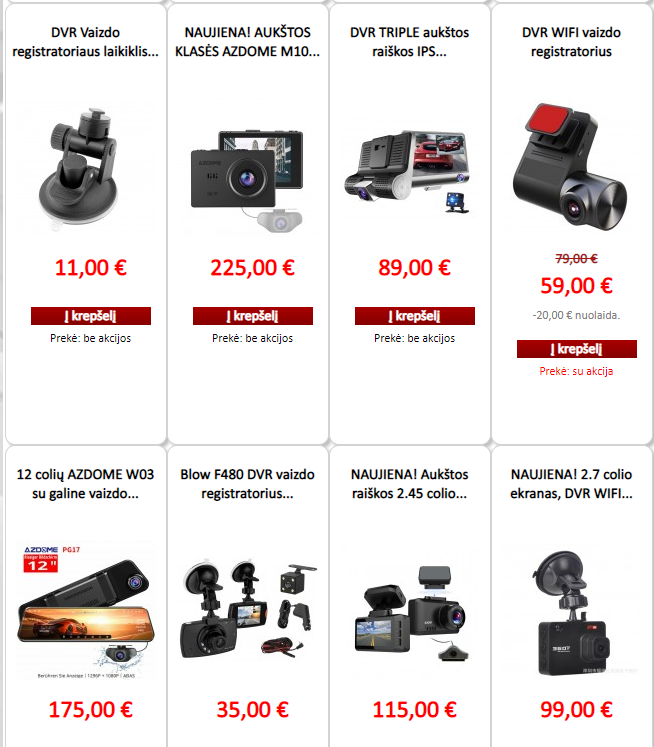 1. DVR - CAMCORDER VAIZDO REGISTRATORIUS FULL HD KOKYBĖS SU NAKTINIU PAŠVIETIMU. MINI, legvas, patvarus, patikimas vaizdo registratorius. Patogu montuoti, mažai pastebimas vaizdo registratorius fiksuos priekyje esantį vaizdą FULL HD vaizdo kokybe. 45eur 2. NAUJIENA! AUKŠTOS KLASĖS AZDOME M10 4K 2160P 24 FPS, 150 LAIPSNIŲ VAIZDO REGISTRATORIUS. AZDOME M10 vaizdo registratorius. PUIKUS OLED 4K liečiamas ekranas. Turi WIFI, GPS, 150 apžvalgos kampą, G-Sensorių, 3" ekraną, HDR technologiją, magnetinį tvirtą laikiklį, automatinę parkavimo funkciją, galinę vaizdo kamerą, PALAIKO IKI 256GB ATMINTIES KORTELĘ. 199eur 3. DVR DUAL GPS VAIZDO REGISTRATORIUS SU DVIEM KAMEROM.Dviejų kamerų vaizdo registratorius su integruota GPS antena. Filmuoja priekį ir saloną. 189Eur