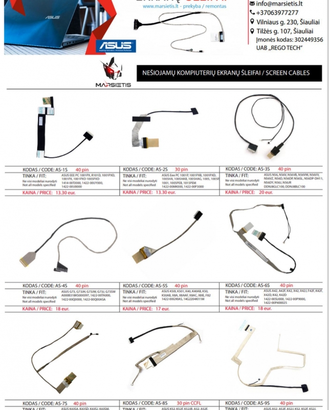 PIGIAUSIAI. ASUS nešiojamų kompiuterių ekranų šleifai PIGIAUSIAI. ASUS kompiuterio ekrano šleifai. Pristatymas visoje Lietuvoje per 1-2 d.d. (DPD kurjeriu, paštomatu, paštu, galima atsiimti vietoje). Suteikiama garantija 12 mėnesių. Visa konsultacija, remonto darbų užsakymas: +37063977277 / info@marsietis.lt / Vilniaus 230, Šiauliai