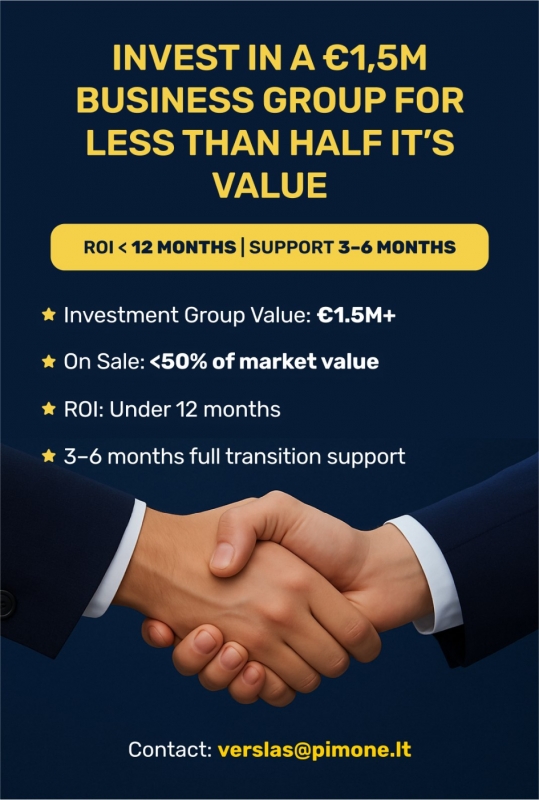 VIRŠ €1,5 MLN VERTĖS VERSLO GRUPĖ LIETUVOJE – PARDUODAMA UŽ MAŽIAU NEI PUSĘ REALIOS VERTĖSRetai pasitaikanti galimybė įsigyti pelningą ir diversifikuotą verslo grupę Lietuvoje, kurią sudaro keli sėkmingi, įsitvirtinę ir veikiantys verslai. Visi verslai yra pelningi, pilnai funkcionuojantys ir turi aiškiai parengtas plėtros strategijas, kurias galima įgyvendinti su minimaliomis papildomomis investicijomis. Dabartiniai savininkai nukreipia dėmesį į naujus dirbtinio intelekto (AI) ir tarptautinius technologijų projektus — todėl visa grupė šiuo metu parduodama su reikšminga nuolaida.