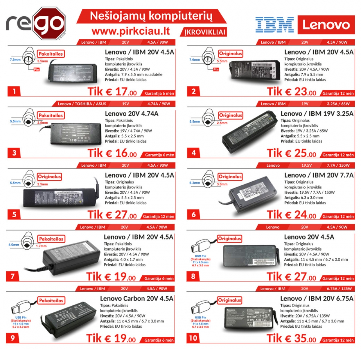 PASIRINKIMAI: 1. PAKAITALAS / Lenovo / IBM / 20V / 4.5A / 90W /7.9 – 5.5mm + Pin / TIK 17.00 Eur 2. ORIGINALUS / Lenovo / ASUS/ TOSHIBA / 20V / 4.5A / 90W / 7.9 – 5.5mm + Pin / TIK 23.00 Eur 3. PAKAITALAS / Lenovo / IBM / 19V / 4.74A / 90W / 5.5 – 2.5mm / TIK 16.00 Eur 4. ORIGINALUS / Lenovo / IBM / 19V / 3.25A / 65W / 5.5 – 2.5mm / TIK 25.00 Eur 5. ORIGINALUS / Lenovo / IBM / 20V / 4.5A / 90W / 5.5 – 2.5mm / TIK 27.00 Eur 6. PAKAITALAS / Lenovo / IBM / 20V / 4.5A / 90W / 4.0 – 1.7mm / TIK 19.00 Eur 7. ORIGINALUS / Lenovo / 19.5V / 7.7A / 150W / 6.3 – 3.0mm / TIK 24.00 Eur 8. PAKAITALAS / Lenovo / IBM / 20V / 4.5A / 90W / stačiakampis (11 x 4.5mm, 6.7 x 3.0mm) / TIK 19.00 Eur 9. ORIGINALUS / Lenovo / IBM / 20V / 4.5A / 90W / stačiakampis (11 x 4.5mm, 6.7 x 3.0mm) / TIK 27.00 Eur 10. ORIGINALUS / Lenovo / IBM / 20V / 6.75A / 135W / stačiakampis (11 x 4.5mm, 6.7 x 3.0mm) / TIK 35.00 Eur